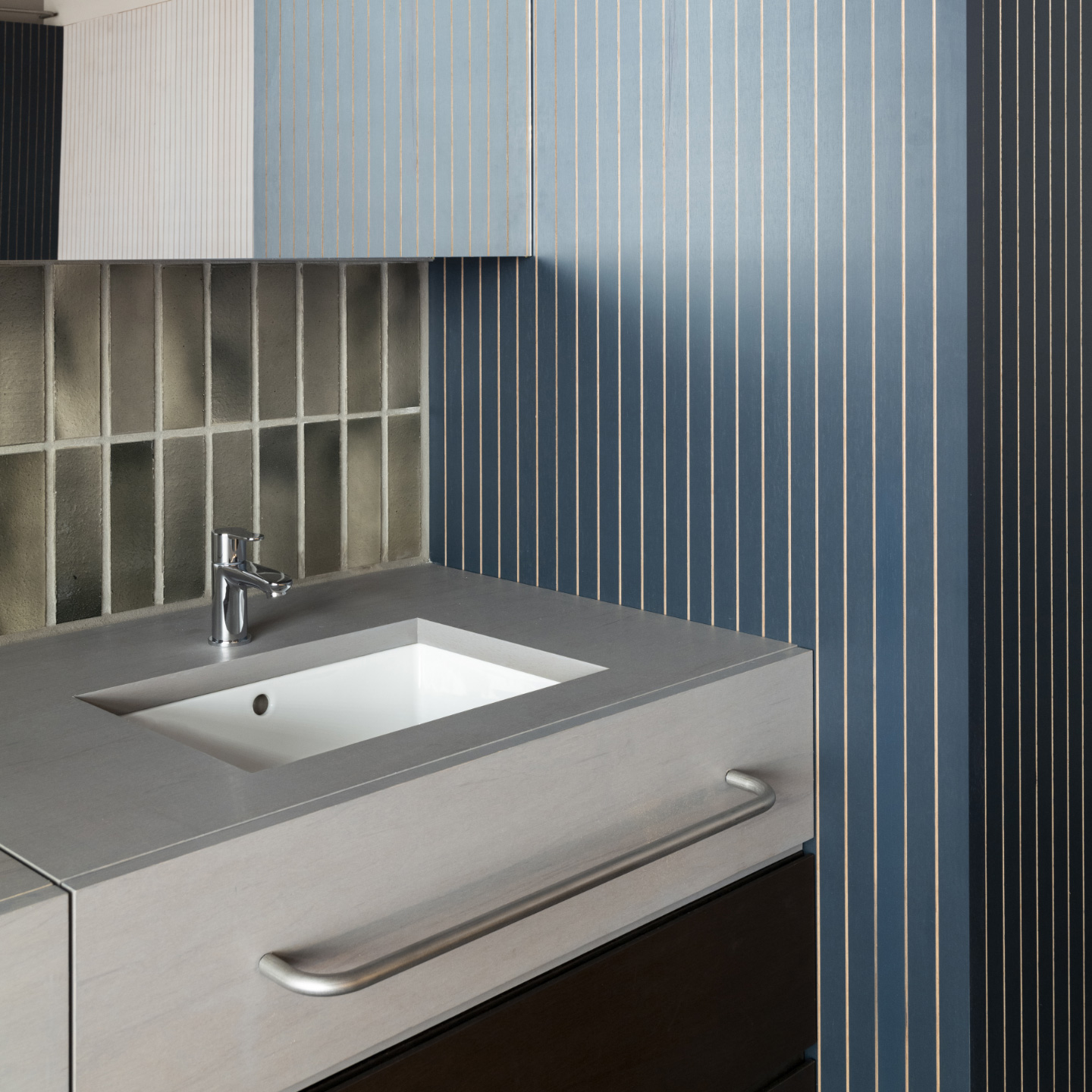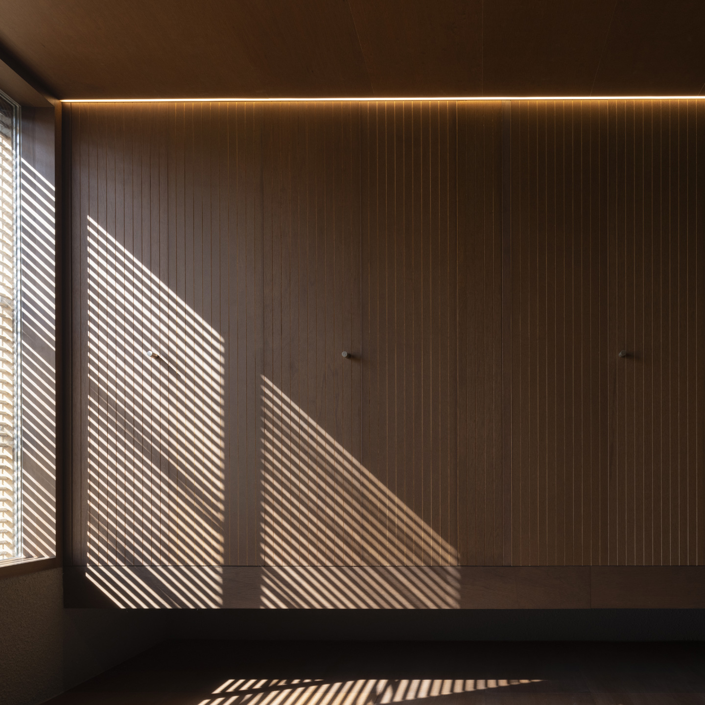 例えば、一定のリズムで作り出される2.5㎜の溝は450㎜地点で床の割付と合流する。オリジナルモデュールを用いることで異なる部材の取り合い部に至るまで完全に整合し、統一された空間が形成される。